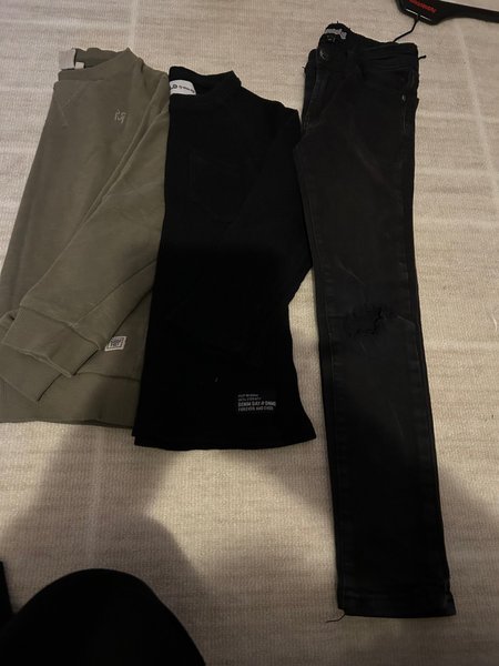 2 tröjor, ett par jeans med hål på båda knän (köpta såna) ställbar midja.