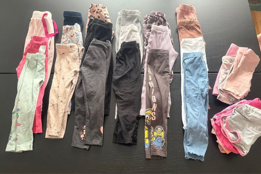 Ett paket med leggings i olika färger och mönster. Innehåller enfärgade leggings, leggings med tryck och leggings med detaljer som volanger.