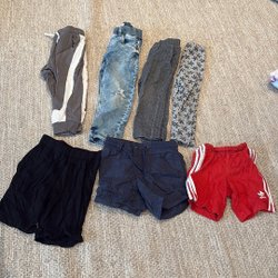 Ett set med fem barnklädesplagg. Setet innehåller ett par gula byxor, ett par grå byxor, ett par jeansshorts, en grå stickad väst och en brunaktig sparkdräkt med ett tigeransikte på.