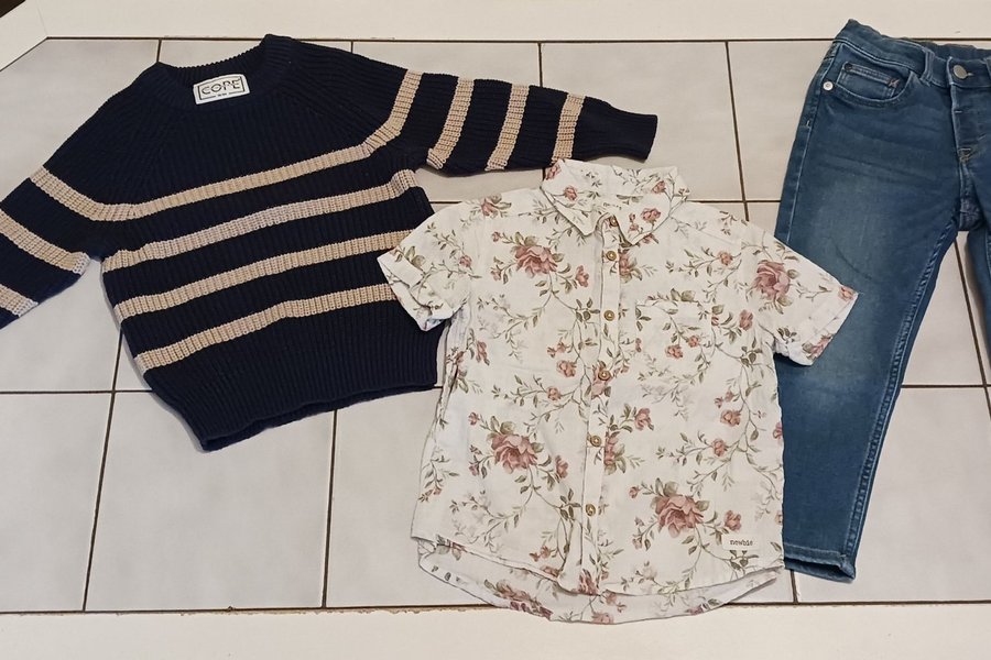 Fint klädpaket med kortärmad skjorta från newbie stl 104. Fin tröja stl 98/104 och jeans från kappahl stl 104. Jeansen har ställbar midja med resår och knapp.