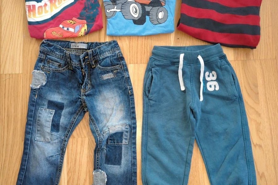 Detta är ett klädpaket med två t-shirts, en tröja, ett par jeans och ett par byxor.