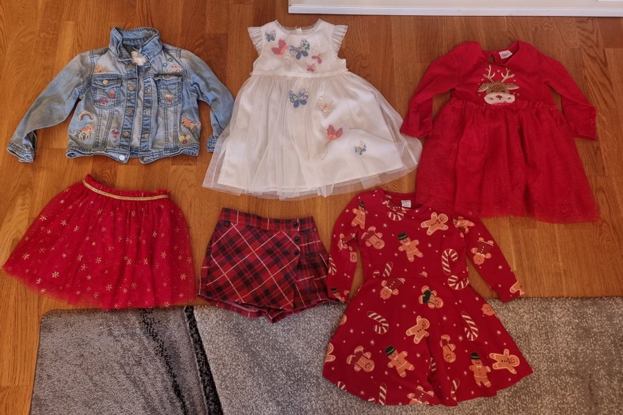 Detta är ett klädpaket med en jeansjacka med broderade detaljer, en vit klänning med fjärilsapplikationer, en röd klänning med renmotiv, en röd kjol med guldfärgade detaljer, ett par röd- och svartrutiga kjol/shorts samt en röd klänning med pepparkaksgubbar och polkagrisar.