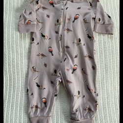 Vit sparkdräkt med grå prickar och dragkedja framtill. På baksidan finns ett tryck av ett grått kaninansikte.