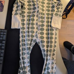 Pyjamas i vit/ljusgrå/svart/gul. Muddarna vid ärm- och benslut är extra långa och går att vika ned allteftersom barnet växer.