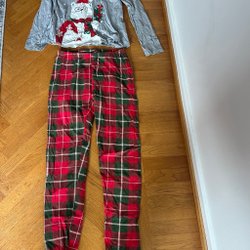 Ett set med en långärmad tröja och ett par byxor. Tröjan är mörkblå med ett tryck av en jultomte med solglasögon och en spelkontroll. Byxorna är rutiga i färgerna rött, vitt och blått.