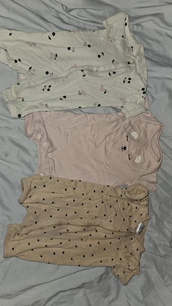 Tre pyamaser. En vit med körsbärsmönster, en rosa med ett björnansikte och en beige med svarta prickar.