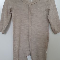 Tre babyplagg i storlek 68. En grå med knappar och två pyjamasar med dragkedja och mönster.