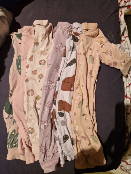 Ett set med 6 pyjamasar i olika färger och mönster. Pyjamasarna har dragkedja framtill och långa ärmar.