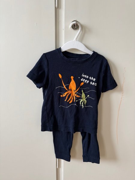 Mörkblått set med kortärmad t-shirt och matchande byxor. T-shirten har ett tryck med två bläckfiskar och texten "into the deep sea".