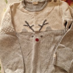 Grå stickad tröja med ett mönster av isbjörnar runt halsen. Tröjan har en mörkblå halslinning och en knapp på axeln. Husdjur finns i hemmet