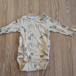 Två långärmade bodys. En svart med vita tryck av bland annat krokodiler och hjärtan. Den andra är gul med tryck av geparder. Storlek 86 från Lindex