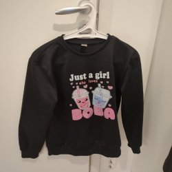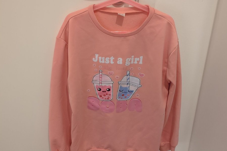 Rosa tröja med trycket "Just a girl who loves boba" och två söta boba-te illustrationer.