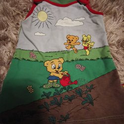 Svart klänning med färgglada kaniner. Klänningen har långa ärmar och en volang nedtill.