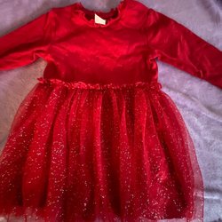 En söt röd klänning med långa ärmar och en liten rosett vid halsen. Klänningen har en fin spetskant nedtill. Sammets liknande tyg. Fin till jul!