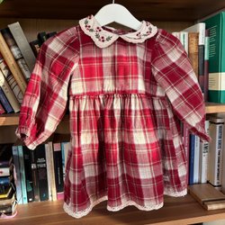 Underbar liten klänning (har endast använts vid jul, så i mycket gott skick), med lång ärm och rutigt mönster i rött och vitt. Säljer en till liknande i annan storlek också.