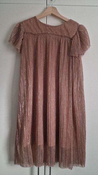 Klänning i en skimrande rosa färg med plisseringar. Den har korta, böljande ärmar och en lös passform.