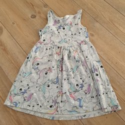 Grå klänning med långa ärmar. Klänningen har en applikation av en fjäril med paljetter framtill. Den har en dragsko i midjan med dekorativa tofsar och två fickor. Något noppig på armarna.