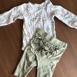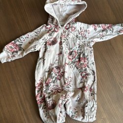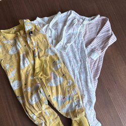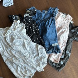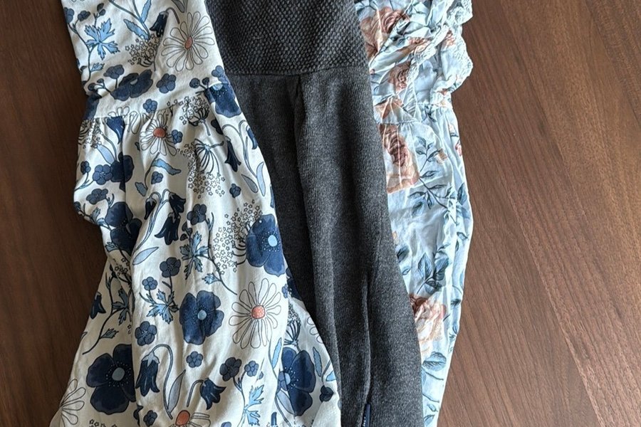 Tre klänningar för barn. En vit klänning med blått blommönster (polaren och pyret), en grå stickad klänning (polaren och pyret) och en ljusblå klänning med persikofärgade blommor (newbie)