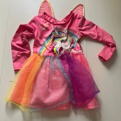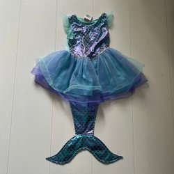 En vacker klänning för barn, perfekt för festliga tillfällen. Klänningen består av en ärmlös topp med broderade detaljer och en matchande kjol med mönster och applikationer. Till klänningen hör även en sjal som kompletterar looken.