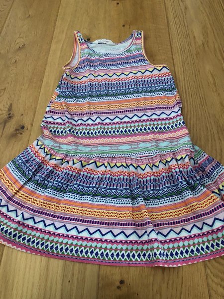 Klänning med ett livfullt mönster i flera färger. Klänningen är ärmlös med rund halsringning och har en volangdetalj i kjolen.HM, st 110/116.(namnmärkt)