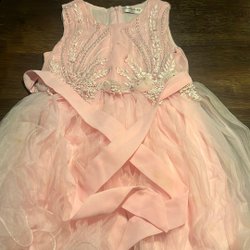 En ljusrosa klänning med små prickar över hela tyget. Klänningen har en rund halsringning och är ärmlös. Midjan är markerad med resår som skapar en fin passform och en utsvängd kjoldel. Baksidan har en öppning med en liten rosett vid nacken.