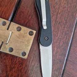 En fällkniv från C. Jul Herbertz med rött handtag och bältesklämma. Bladet är tillverkat av AISI 420 stål och har en serienummer 200911.