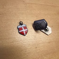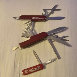 Tre fickknivar. En med korkskruv, en röd med kedja och en mindre, benvit.