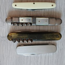 Fickknivar i olika storlekar och modeller. Verktyg som knivblad, såg, korkskruv och flasköppnare finns representerade.