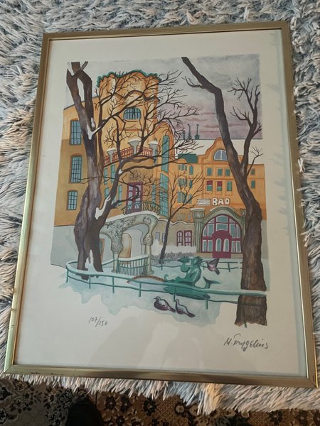 Detta är en färglitografi av Mikael Frygelius (1952-2001) med motiv av Centralbadet i Stockholm.