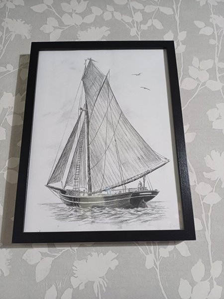 En tavla med handmålad båt. Målat med blyertspenna, ram i svart och riktigt glas.