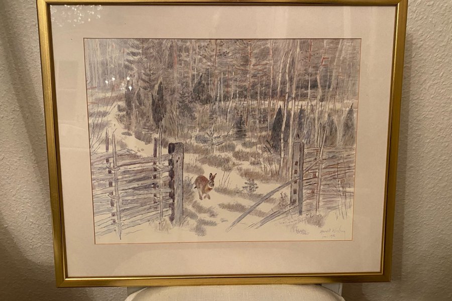 En vacker tavla med motiv av en hare i ett vinterlandskap. Signerad Harald Wiberg jan. 1986.