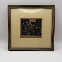 Abstrakt kunsttryk med geometriske former og farver. Trykket har et motiv med sorte og hvide tern, orange cirkler og grønne, lilla og lyserøde farvefelter.