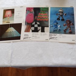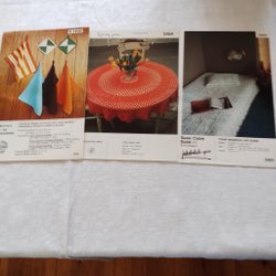 Tre virkmönster för olika projekt. Ett mönster för "Fiffi Cablé" kuddar i 100% akryl. Ett mönster för "Sussi Cablé" grön duk, ca 70 cm i diameter. Ett mönster för "Kantudd till gardinkappa och duk" i Everlasting Merc.