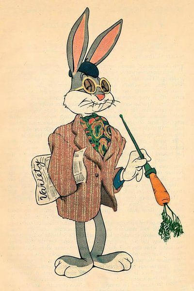 En affisch med en tecknad kanin i en kostym som håller en morot.