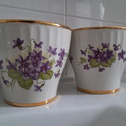 Tre blomkrukor i olika färger.