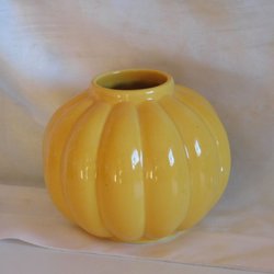 En gul vas. Den är 27 cm hög och 8 cm i diameter upptill. Det finns sprickor i glasyren.