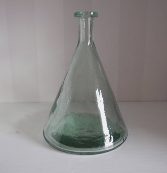 En glasvas med en konisk form och en smal hals. Färgen är transparent med en grönaktig ton. Höjd 15 cm
