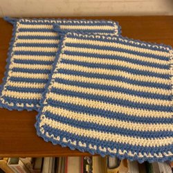 Sju virkade grytlappar i olika färger och mönster.