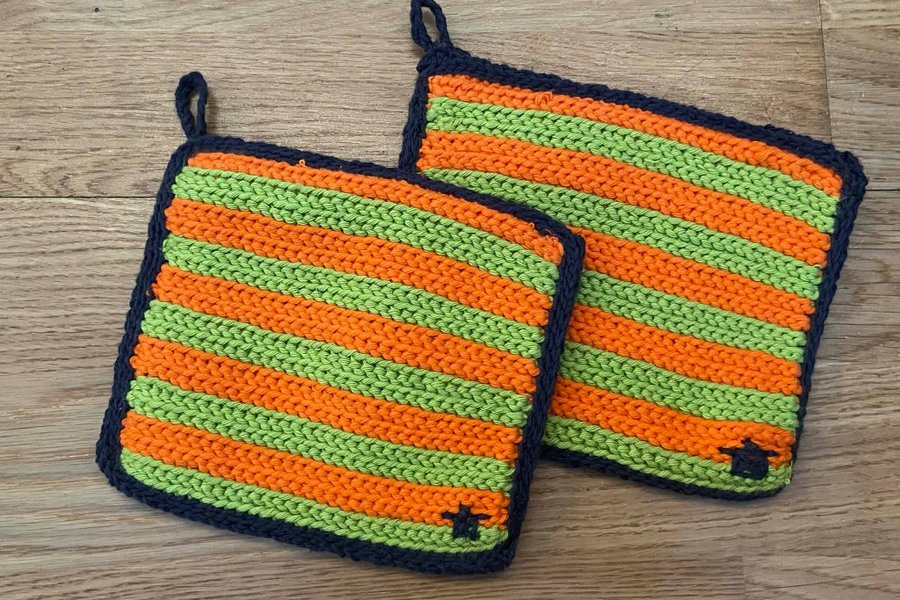 Ett par grytlappar i orange och grön randig design i retro känsla. Varje grytlapp har en ögla för upphängning och Loke.ex egna emblem för grytlappar broderad i ena hörnet.
