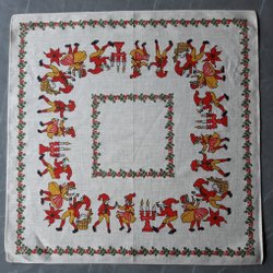 Vackert förkläde i vitt med dekorativa vågiga band i rött och svart. Förklädet har två praktiska fickor framtill och justerbara hängslen med knappar. Nyskick, troligen oanvänt.