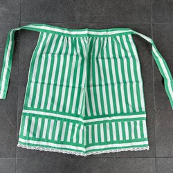 Vitt förkläde med broderade blommor och en ficka framtill. Förklädet har en vågig nederkant och knytband i midjan.