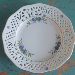 En söt liten assiett med blommönster och blå kant med guldiga detaljer.