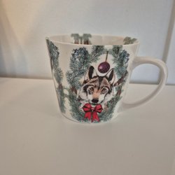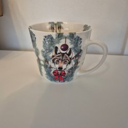 En vacker mugg med detaljerat motiv av fåglar, blommor och en hare. Insidan av muggen har ett motiv av ett fågelbo med ägg. Från Nadja Wedin X Hemtex