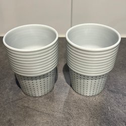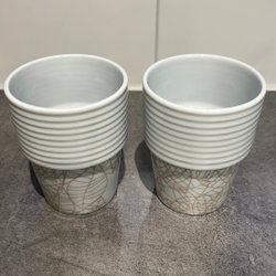Set med 4 vita koppar. Kopparna har ett grått geometriskt mönster.