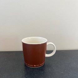 Ett set med sex stycken koppar. Kopparna är tillverkade i keramik och har en brun färg. Varje kopp är försedd med ett handtag. (Fina som glögg koppar)