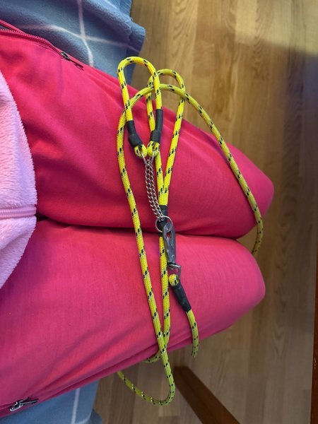 Här är ett gult hundkoppel med svarta detaljer och en silverfärgad kedja.