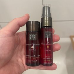 Rituals set innehåller: Elixir Collection keratin recovery hair mask, The Ritual of Hammam hand wash eucalyptus & argan oil och The Ritual of Karma foaming shower gel.