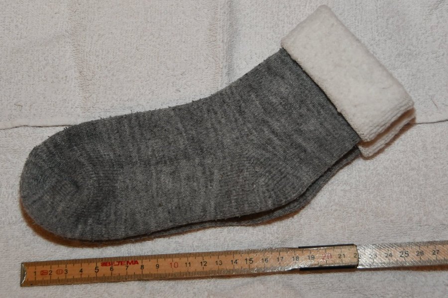 Ett par gråa strumpor med en vit, mjuk kant upptill. Strumporna är vikta och foten är cirka 20 cm lång.