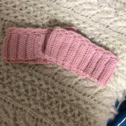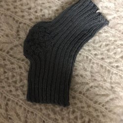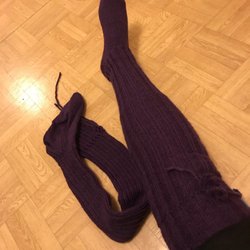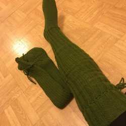 Ett par långa, stickade strumpor i en mörk färg. Strumporna har en ribbad struktur och snörning.