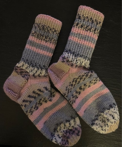 Ett par stickade strumpor med ett flerfärgat mönster. Strumporna har ränder i rosa och grått, samt mönsterdetaljer i mörkare nyanser som lila och svart. Resåren upptill är ribbstickad.